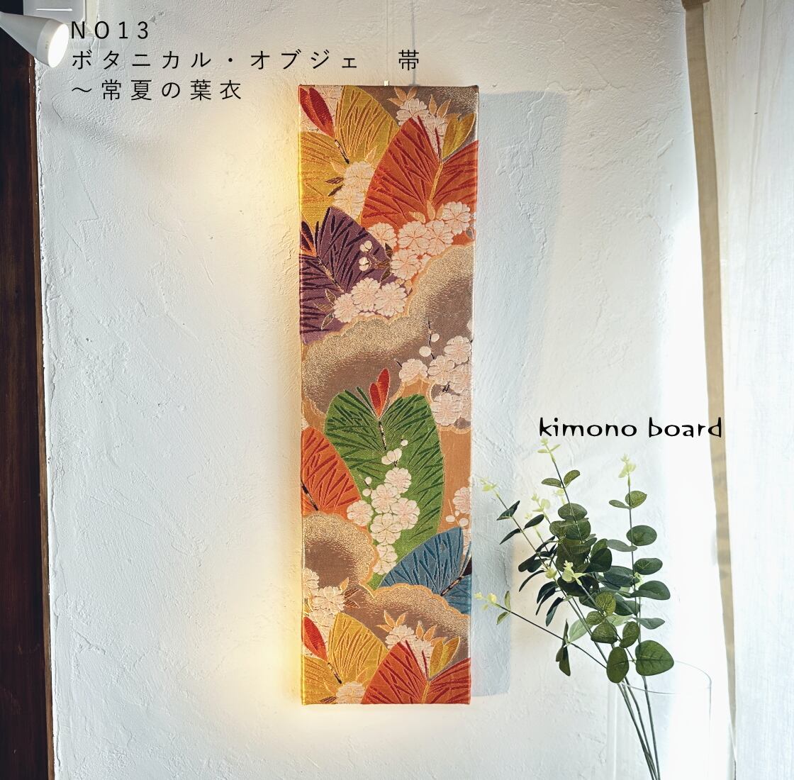 南国の陽光が降り注ぐ、トロピカルな楽園を閉じ込めたかのような色鮮やかな帯を切り取った作品は、一瞬で南の島へと誘います。大胆に配置された大きな葉っぱのモチーフは、エキゾチックな植物の生命力を感じさせ、その間を可憐な小花が彩ります。まるで熱帯の植物たちが織りなす、鮮やかなタペストリーのようです。一枚の帯が持つ色彩とテクスチャーが、新たなアートとして息を吹き返しました。