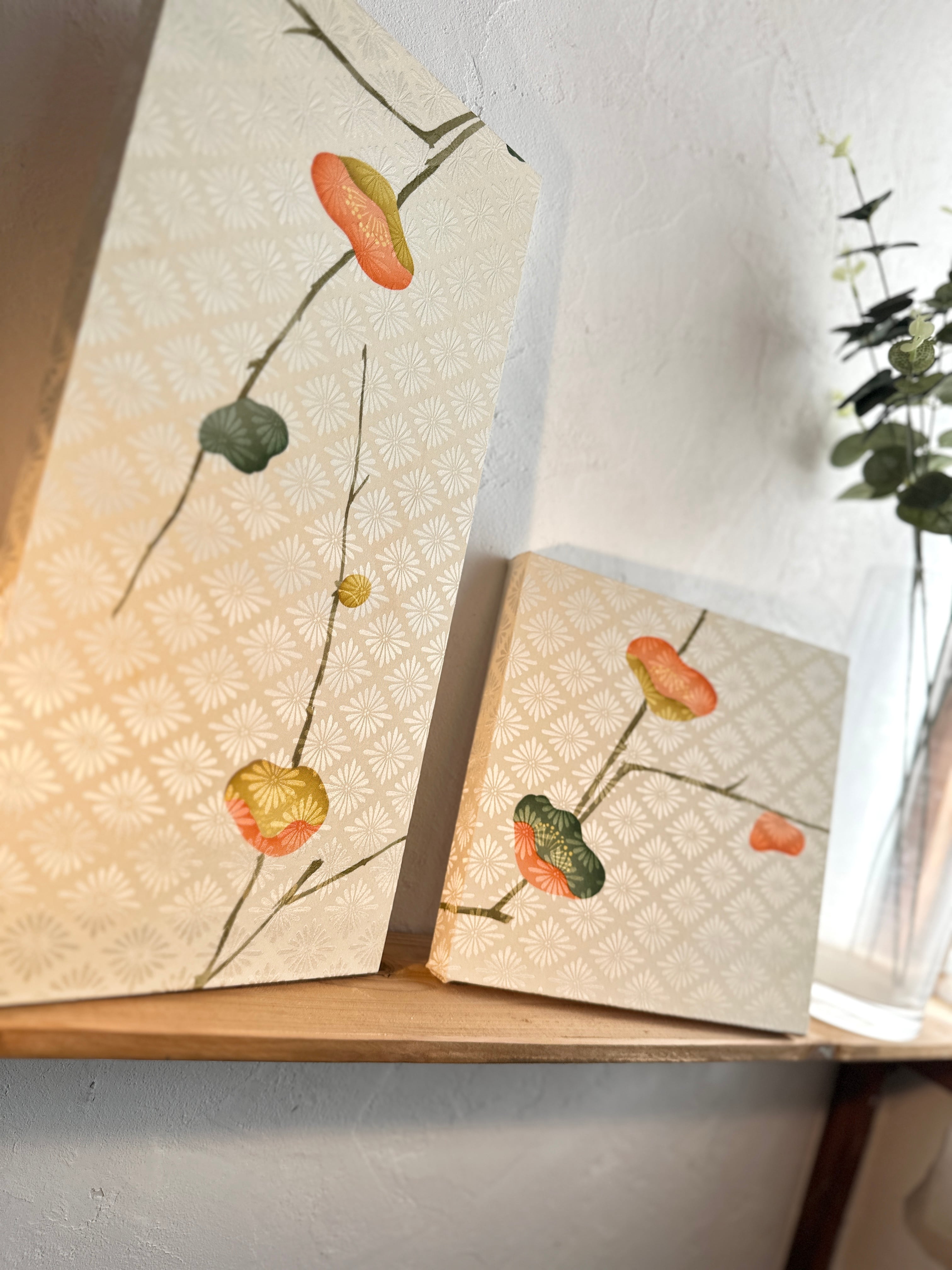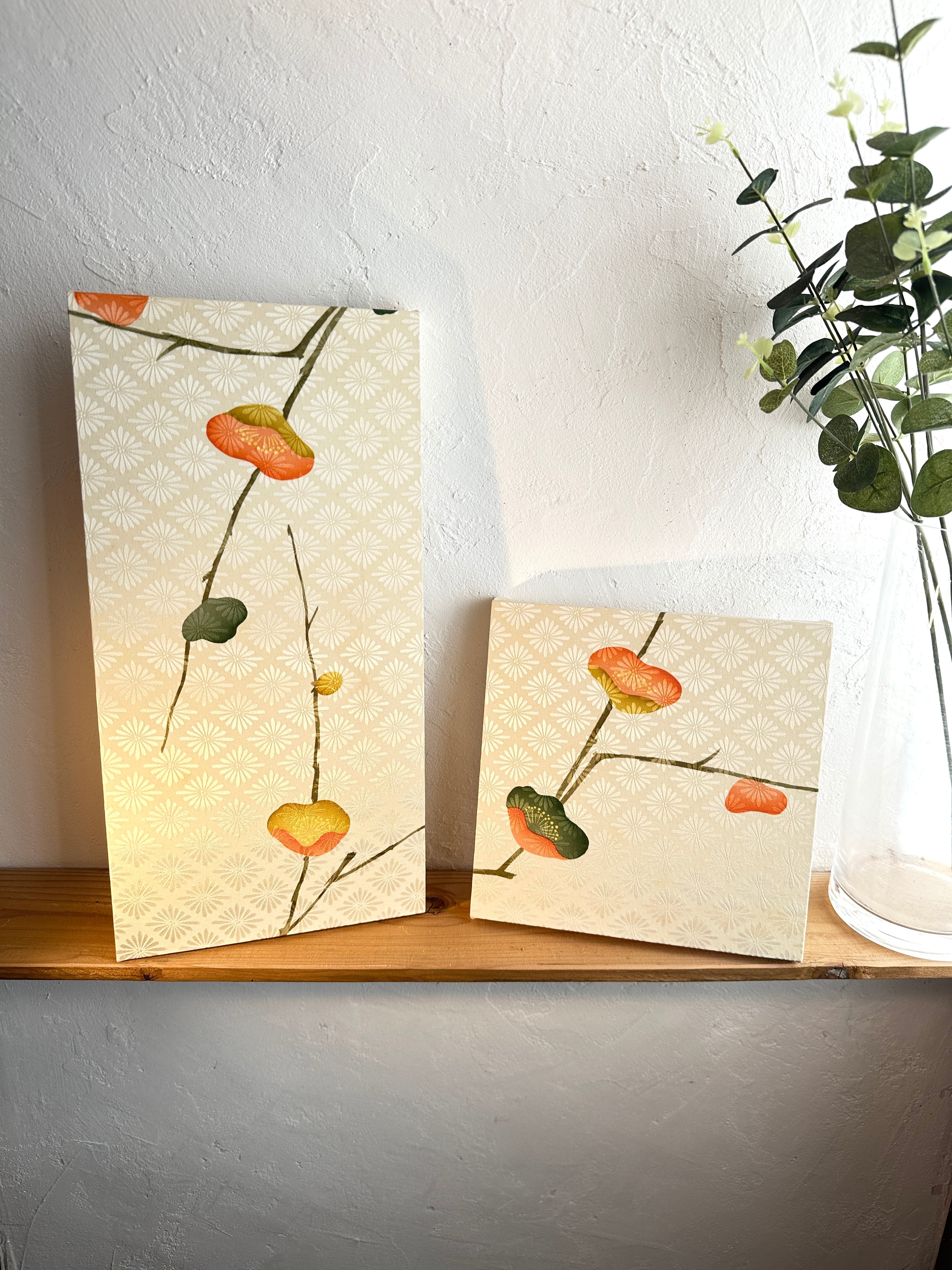 古くから愛される日本の花「椿」を、現代的な感性で表現した「橙椿(だいだいつばき)」写実的な描写から離れ、簡略化されたフォルムは、椿本来の凛とした美しさを保ちつつも、どこか都会的でモダンな印象を与えます。特に目を引く「橙色」は、温かみと情熱を併せ持ち、見る人の心に明るい光を灯します。和とモダンが絶妙に融合したこの「橙椿」は、空間に新たな息吹をもたらし、季節を問わずその存在感を放ち続けるでしょう。