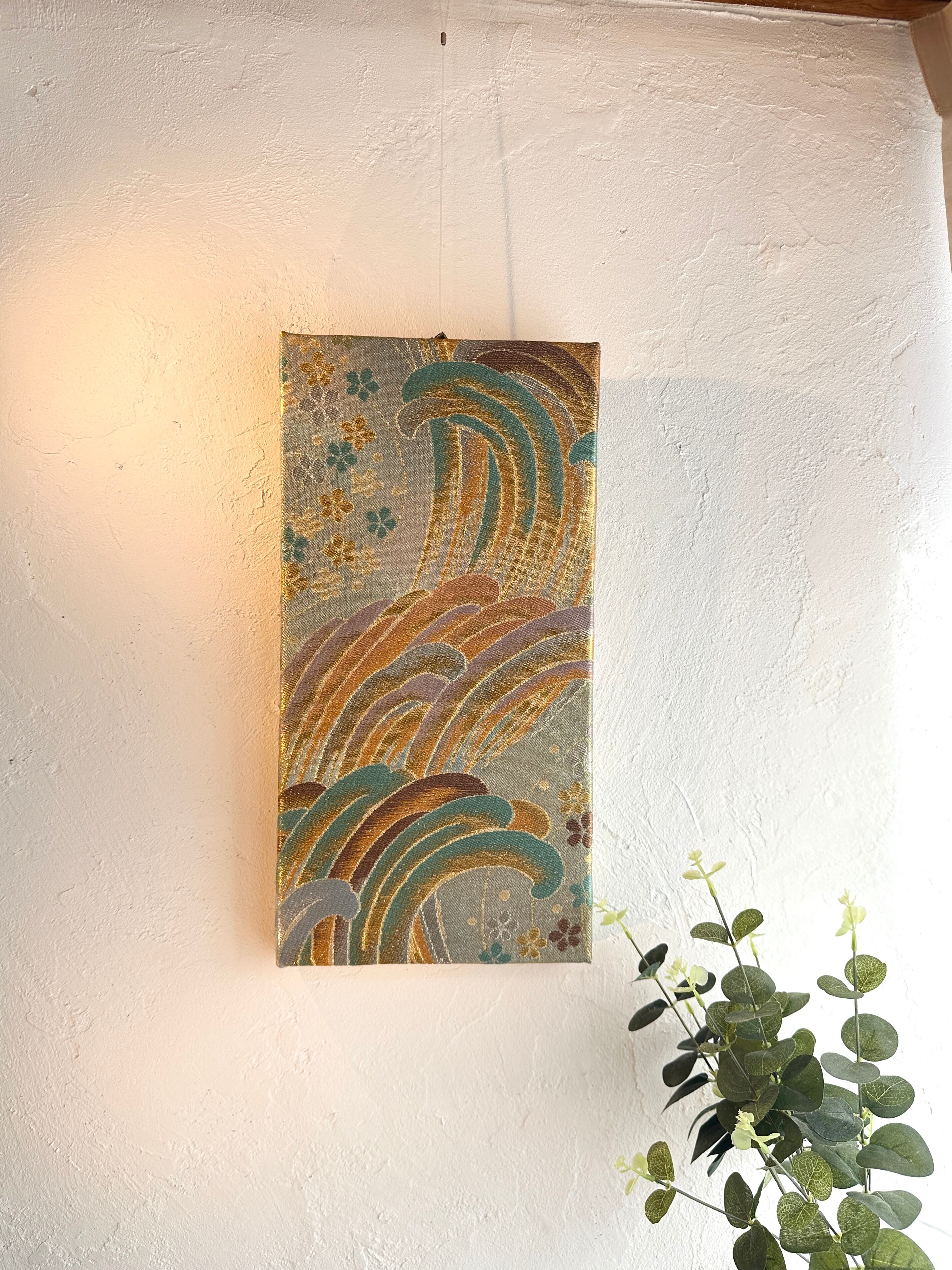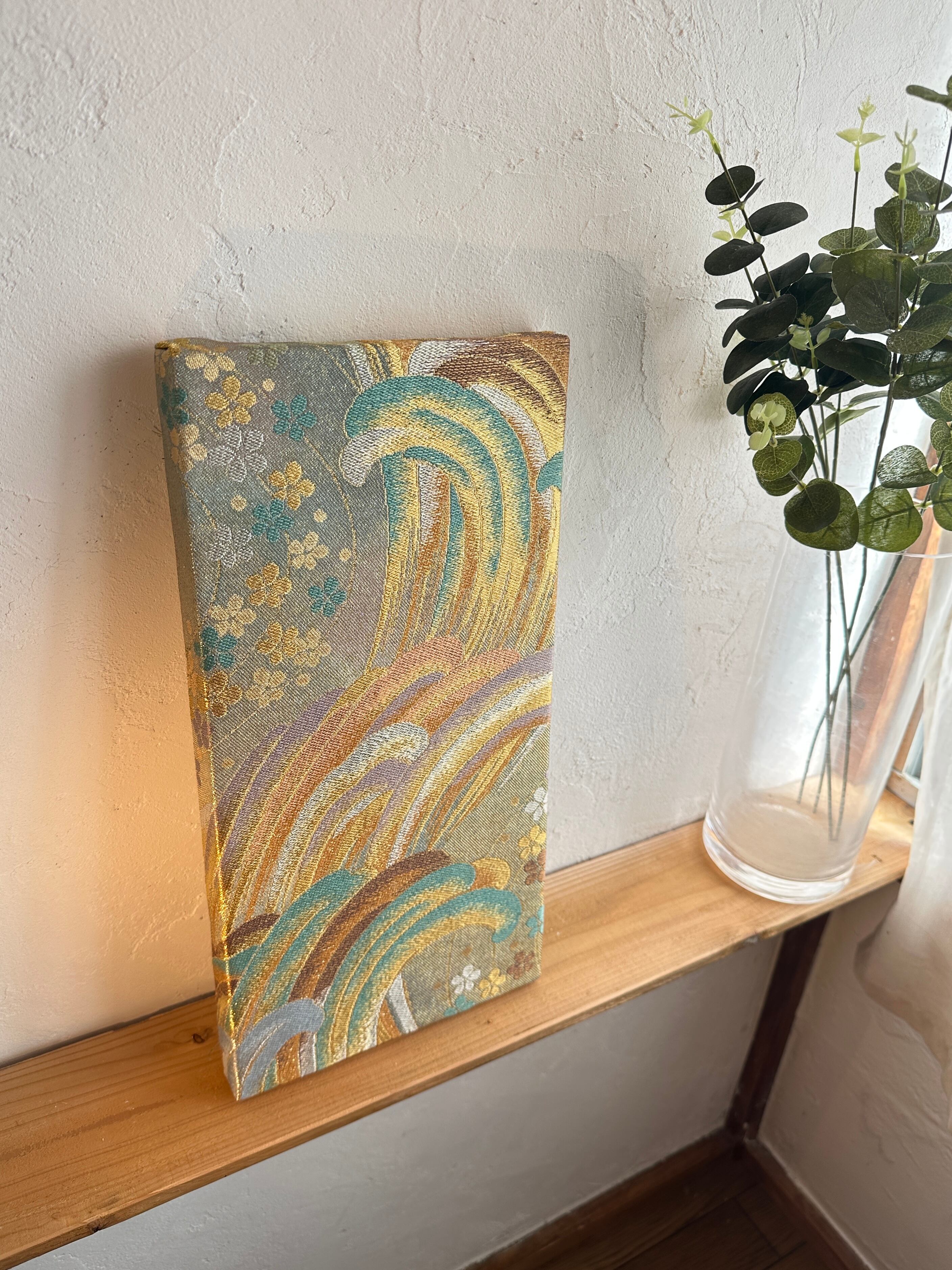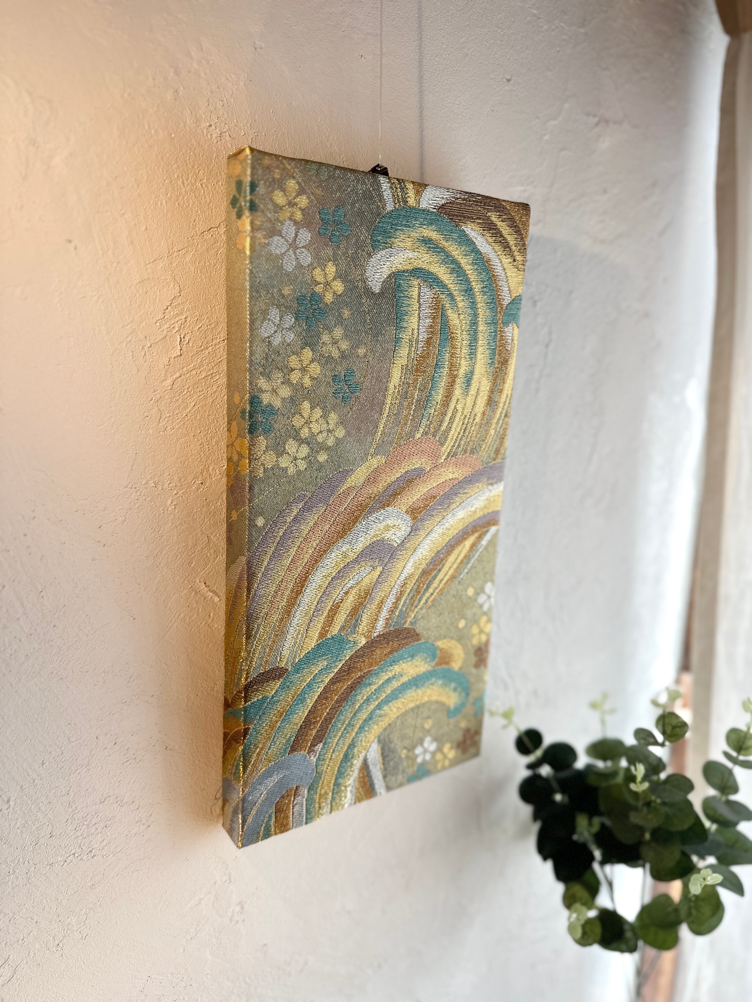 古くから日本の生活や美術の中に息づいてきた波の文様を、現代の感性で再構築した帯のキリトリ。力強くも優雅に連なる波濤の姿は、日本の伝統的な美意識と自然への敬意を象徴し、見る者を時を超えた旅へと誘います。多くの人々を魅了した、波の絵柄が、現代の色彩と繊細な金糸の輝きを得て、新たな命を吹き込まれました。伝統的な波の間に添えられた可憐な小花(桜や梅など)のきらめきは、移りゆく季節の美しさと、令和という時代に芽吹く新しい息吹を表しています。