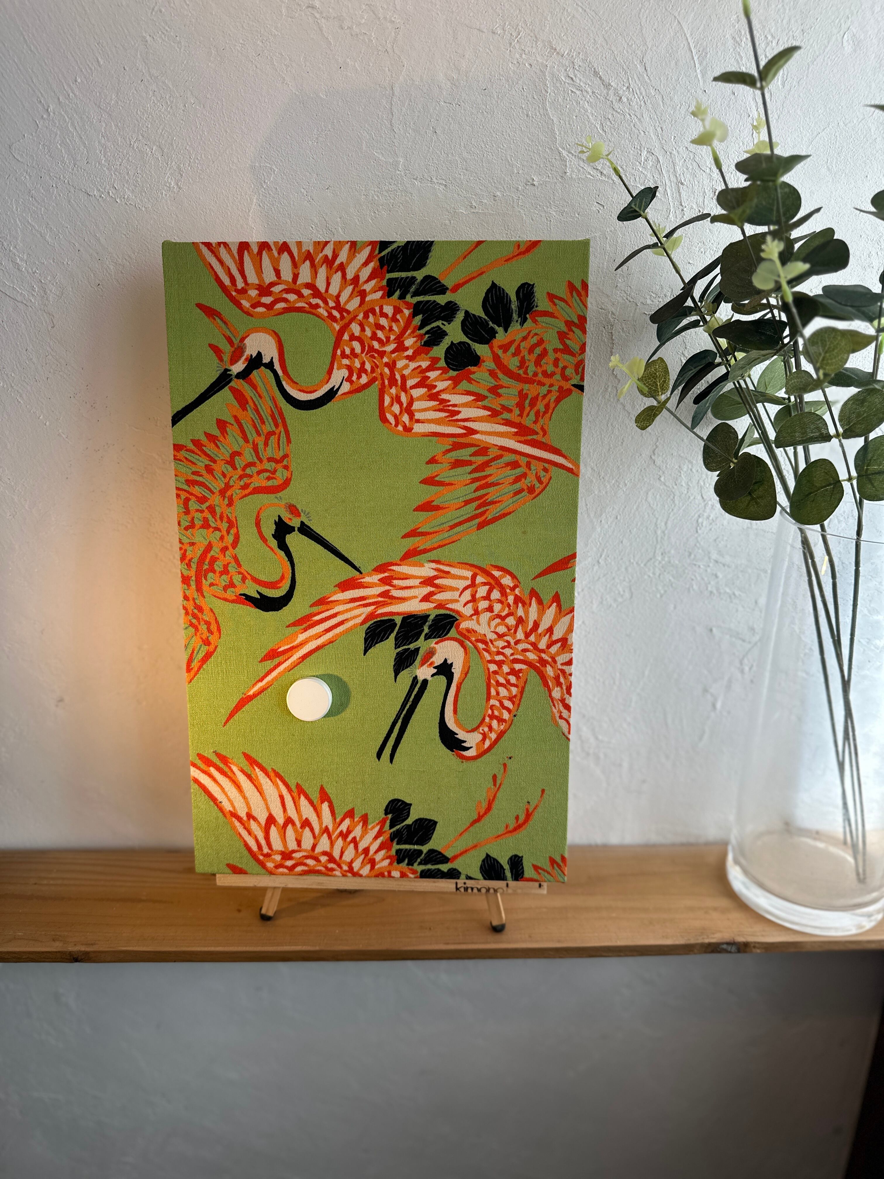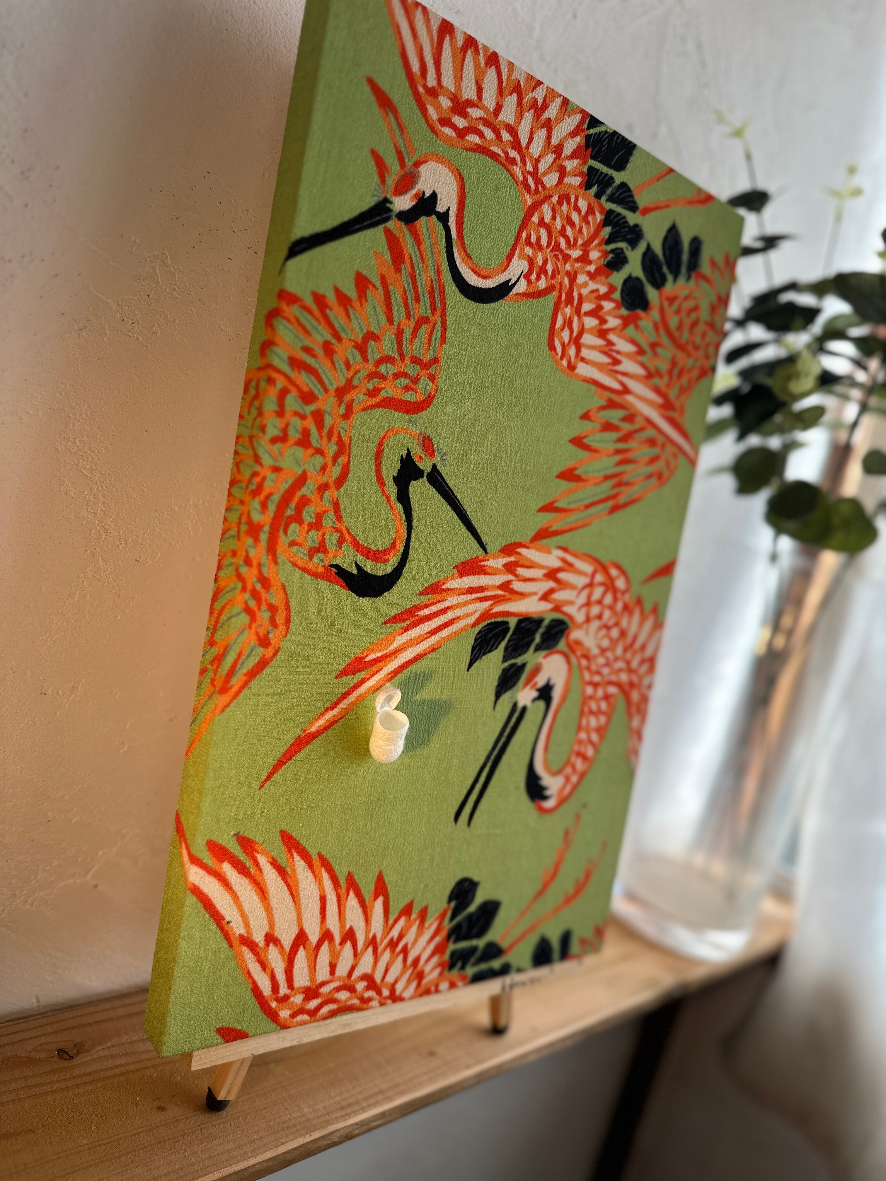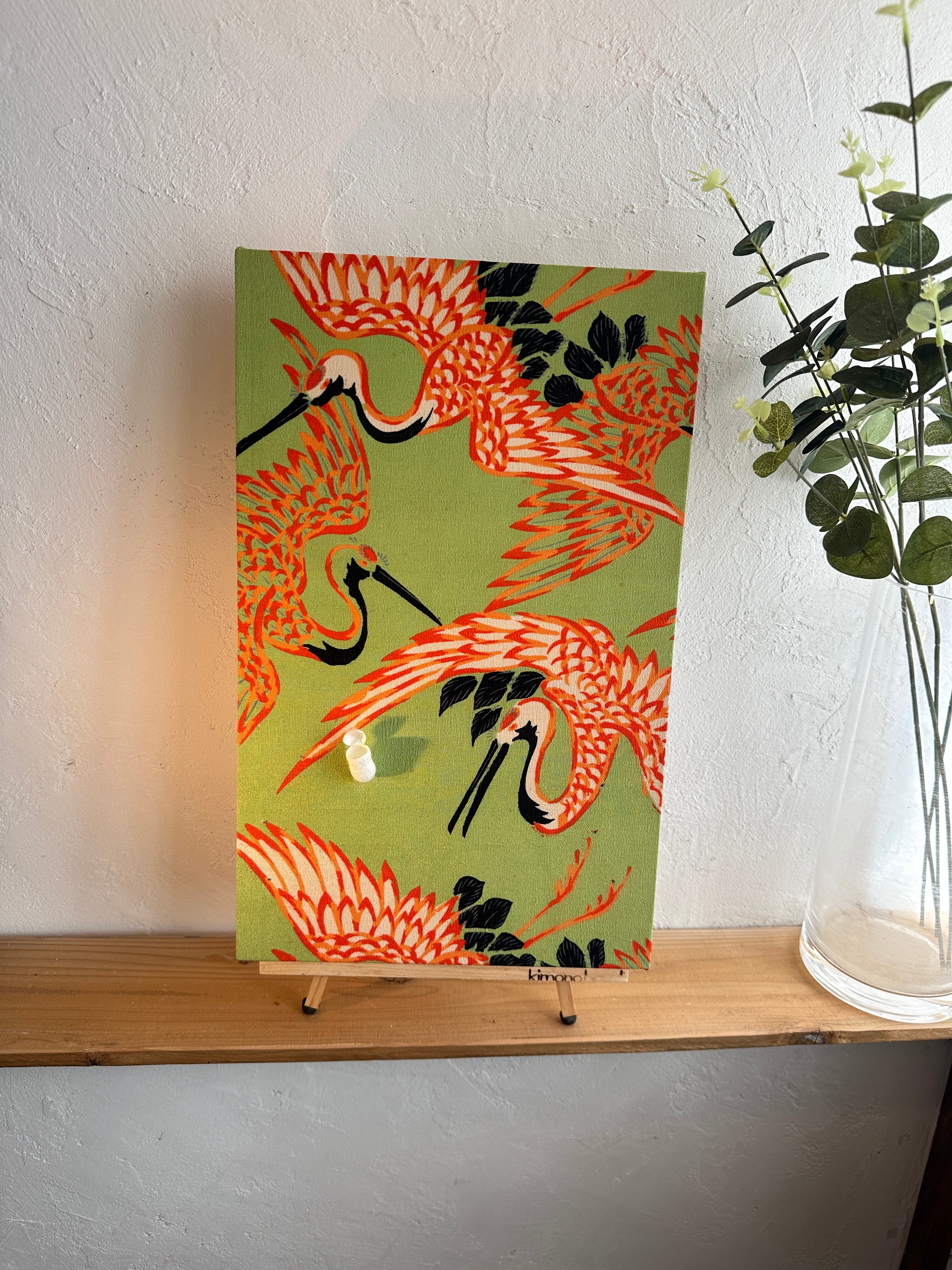 大正時代の息吹を感じさせる、優雅な柄は、鮮やかな抹茶色の地に、縁起の良い飛翔する鶴たちが美しく舞い、見る人の心に希望と長寿の願いを届けます。