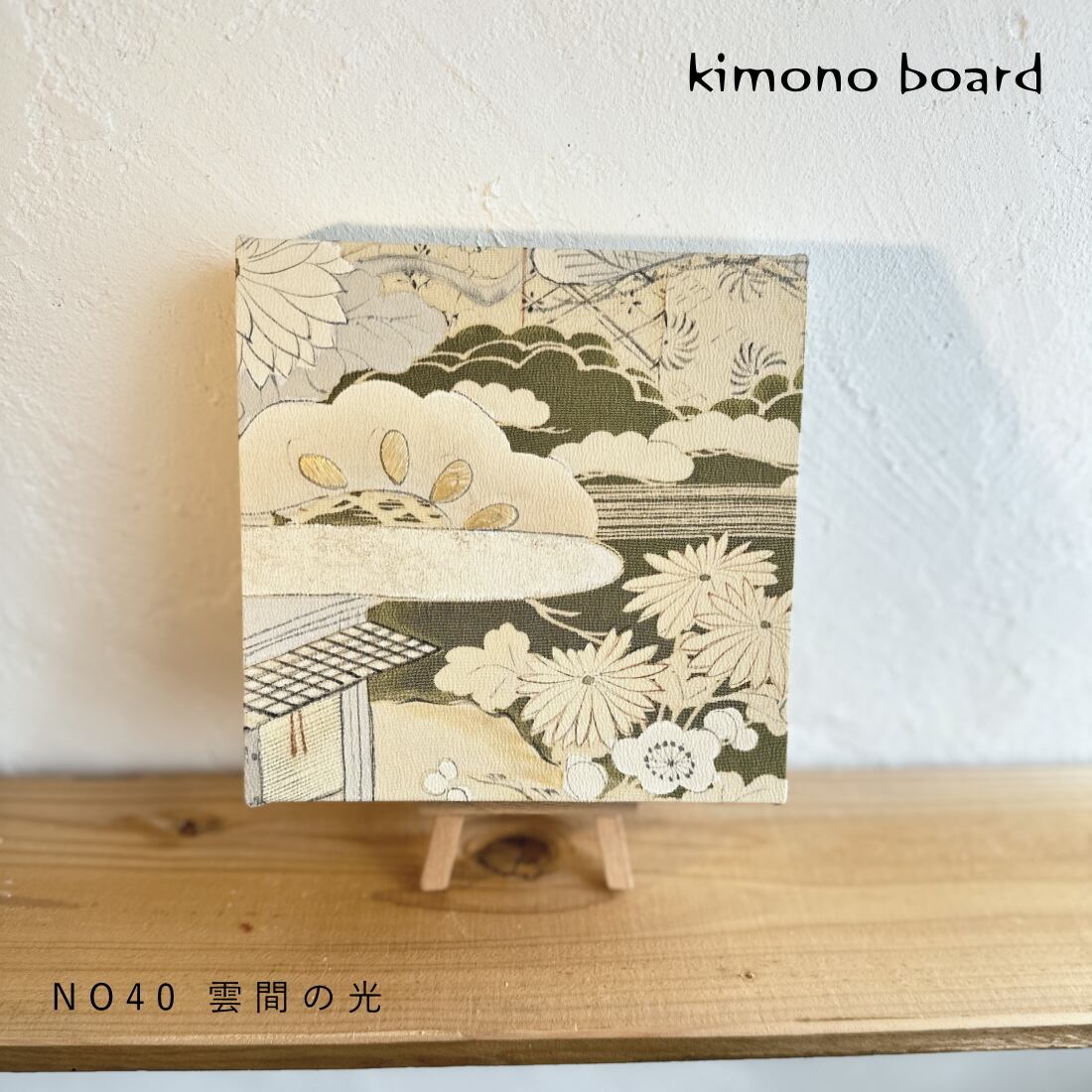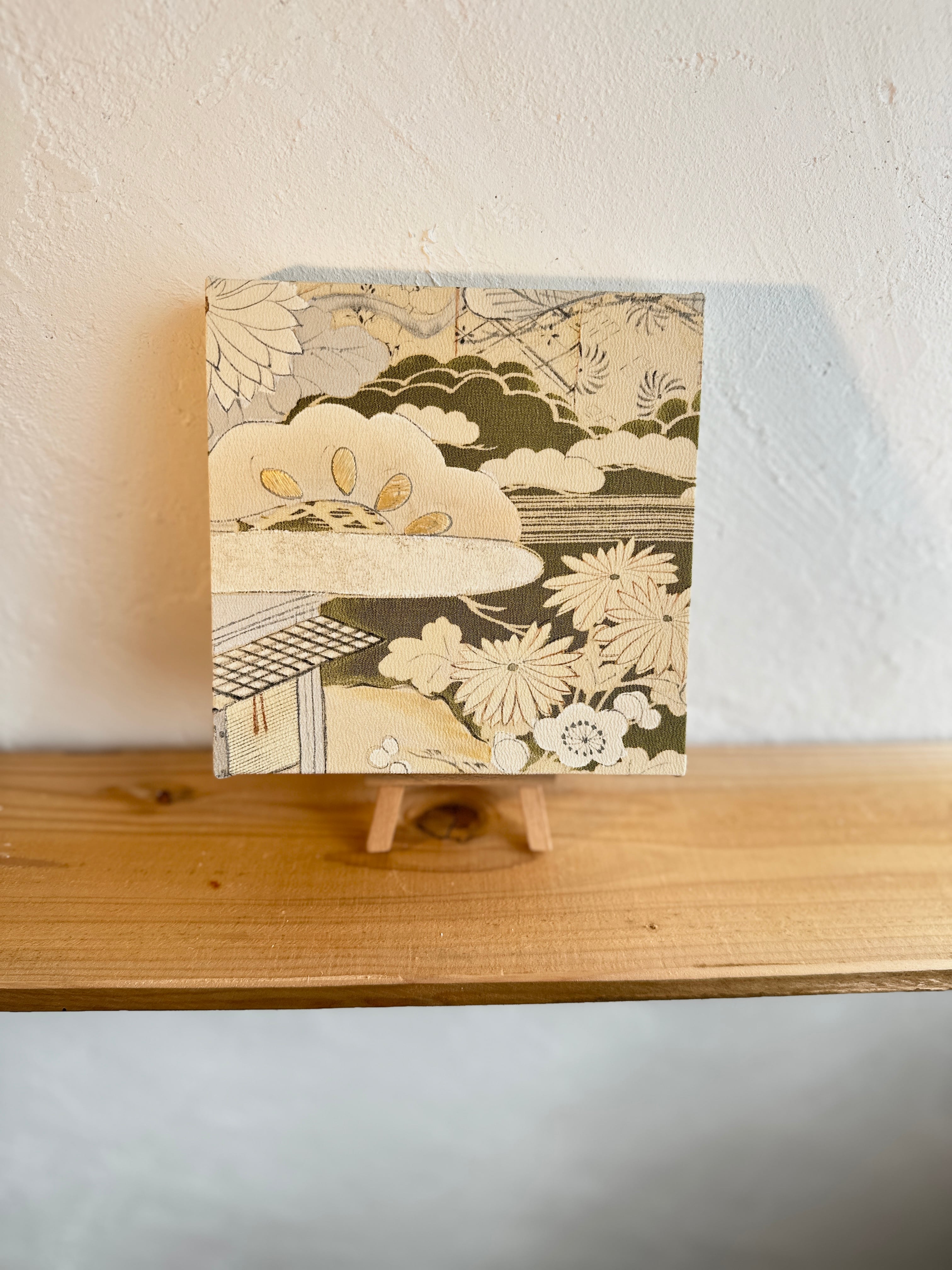 雲の流れ、差し込む光、咲き誇る菊の花。かつては着物を彩った意匠が、こうしてキャンバスに置かれると、絵画のように新しい景色を見せてくれます。時間を重ねた布が持つ力は、ただの模様を超えて、心に映る風景となるのです。