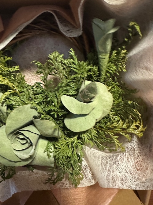 ゆうかりのはっぱでつくった色合いの優しい花々にが散りばめられ、見た目にもシンプルだけど温かみを感じさせてくれます。リースには、自然素材を使用し、ひとつひとつ丁寧に仕上げております。玄関やリビング、また特別な日の装飾にもぴったりです!